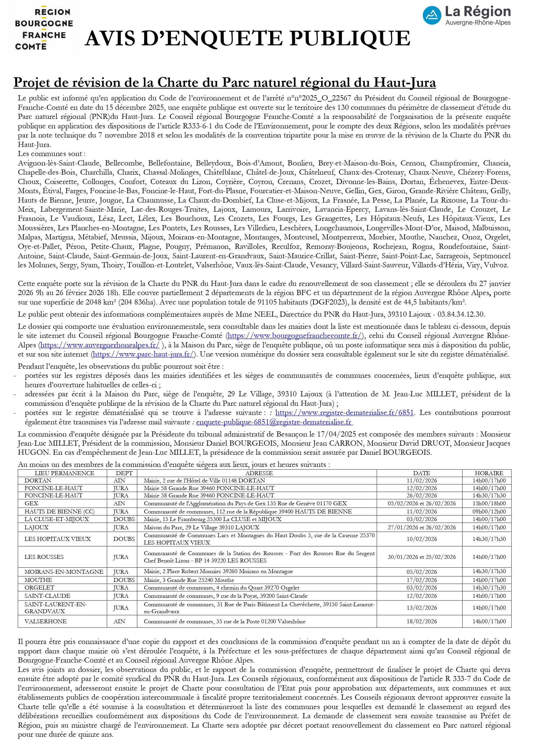 Avis d'enquête publique Projet de révision de la charte du Parc naturel régional du Haut Jura Pour accéder au dossier : https://www.registre-dematerialise.fr/6851